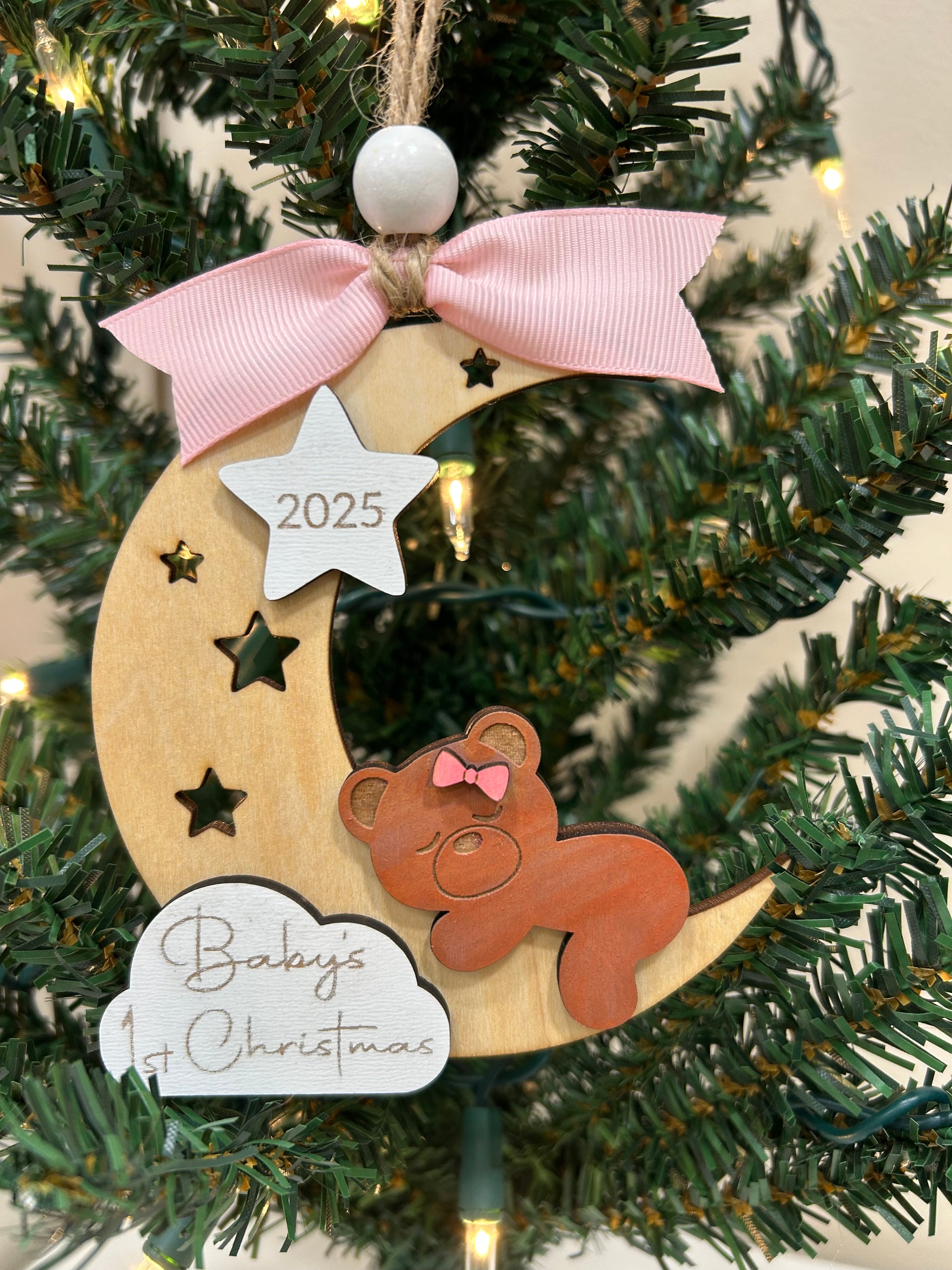 This laser-cut wooden ornament celebrates “Baby girl’s 1st Christmas” with a sleepy teddy bear nuzzling a crescent moon. A white star engraved “2025” twinkles above, surrounded by tiny cut-out stars. A soft pink ribbon bow adds a gentle touch. A sweet, timeless keepsake for the tree.