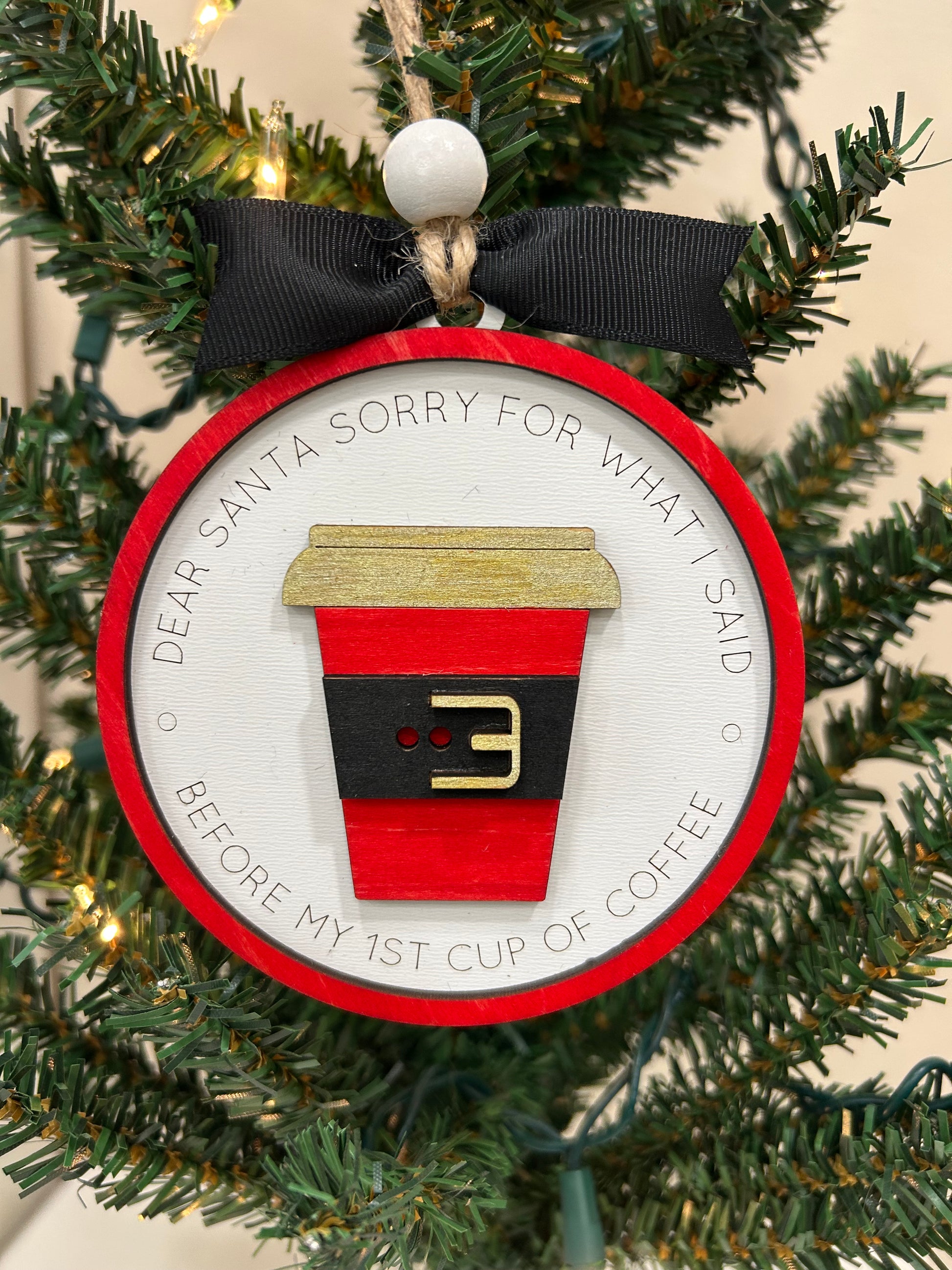 This laser-cut ornament features a red coffee cup with Santa’s belt and the witty phrase: “Dear Santa, sorry for what I said before my 1st cup of coffee.” It’s a playful holiday nod to coffee lovers.