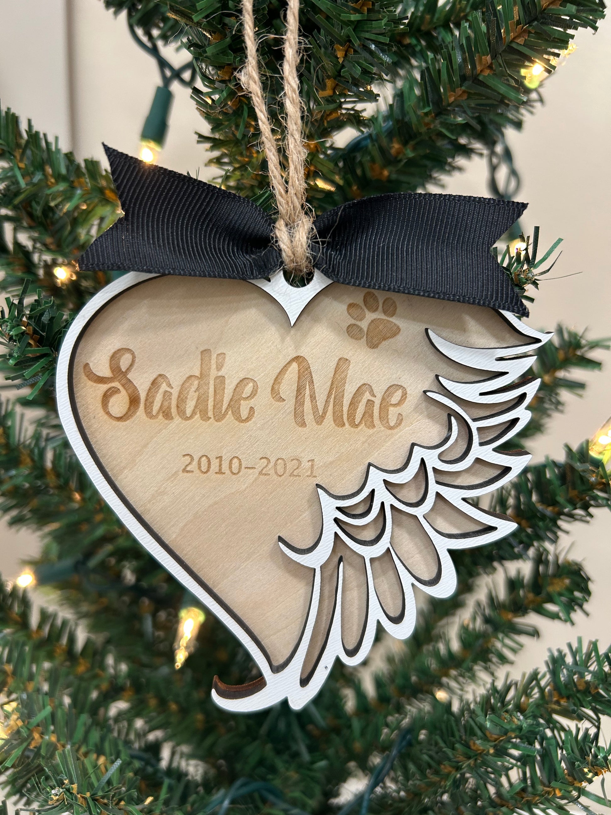 This laser-engraved heart ornament honors “Your loved pet” with delicate angel wings and a paw print. It’s a loving pet memorial keepsake.