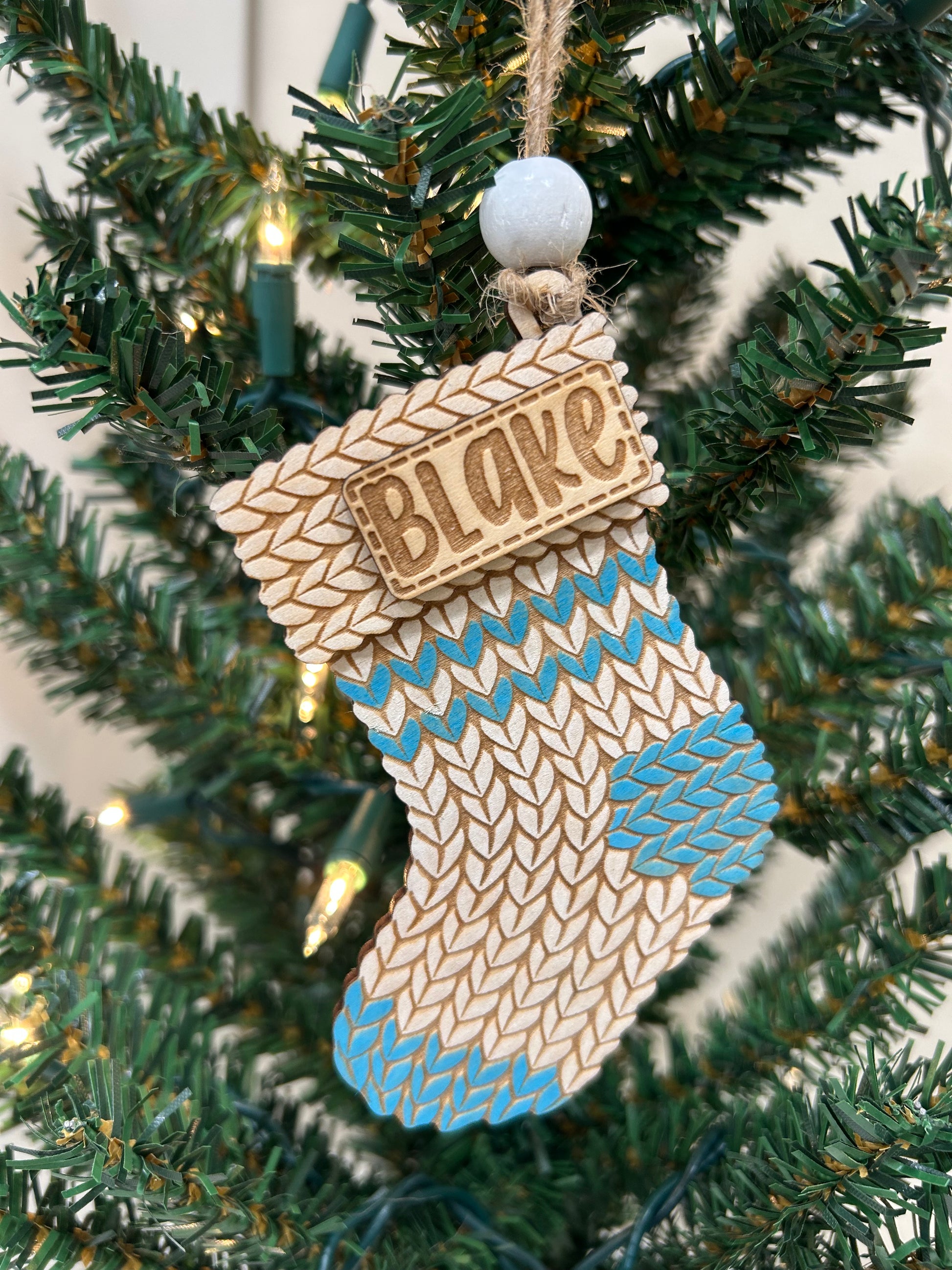 This laser-cut stocking ornament displays a colorful knit pattern and a personalized tag. It’s a charming, cozy holiday keepsake.