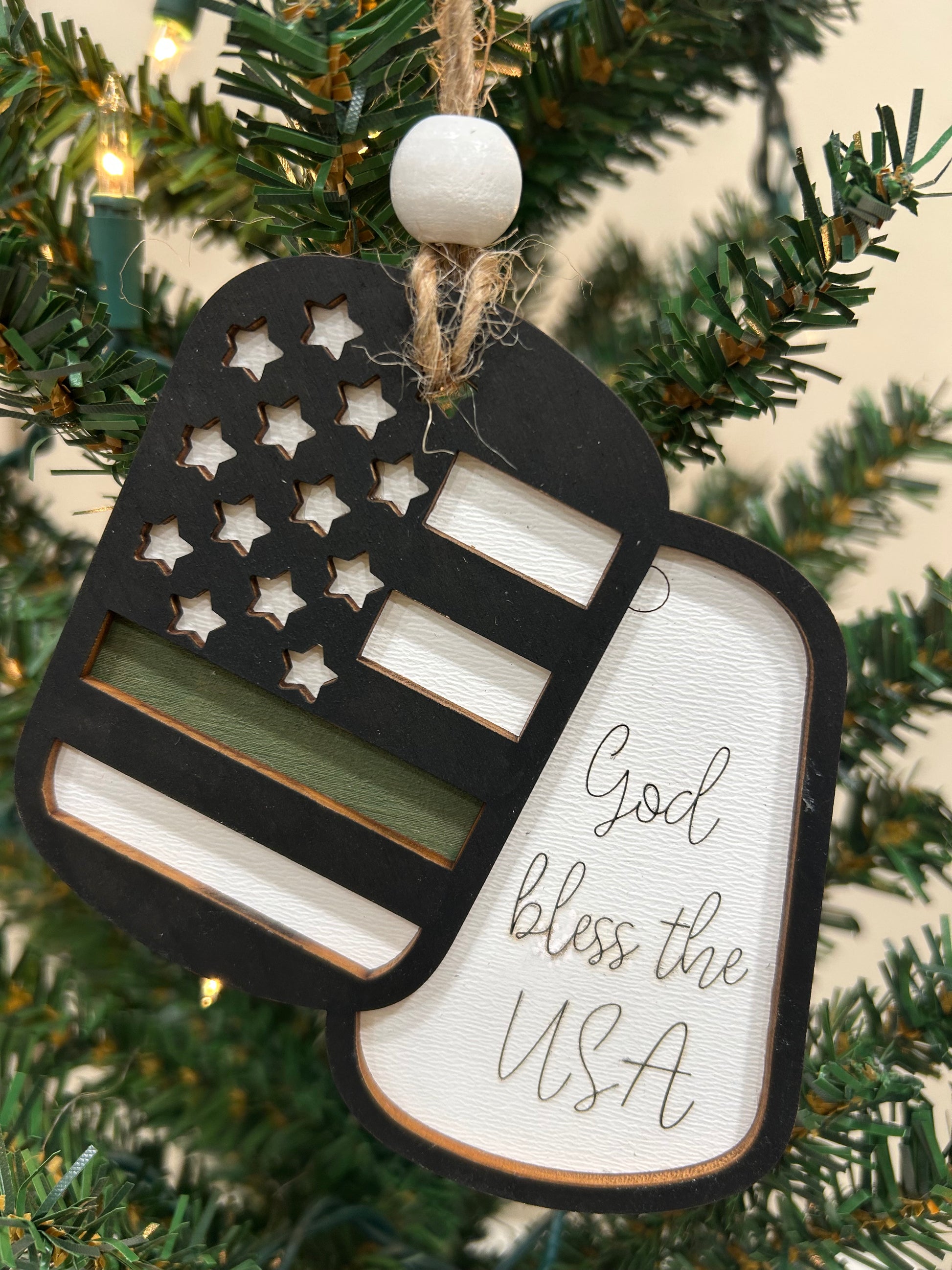 Laser-engraved wooden military dog tag ornament with layered American flag and thin green line. Personalized “ God bless the USA” on white tag. Poignant holiday tribute for veterans and first responders.