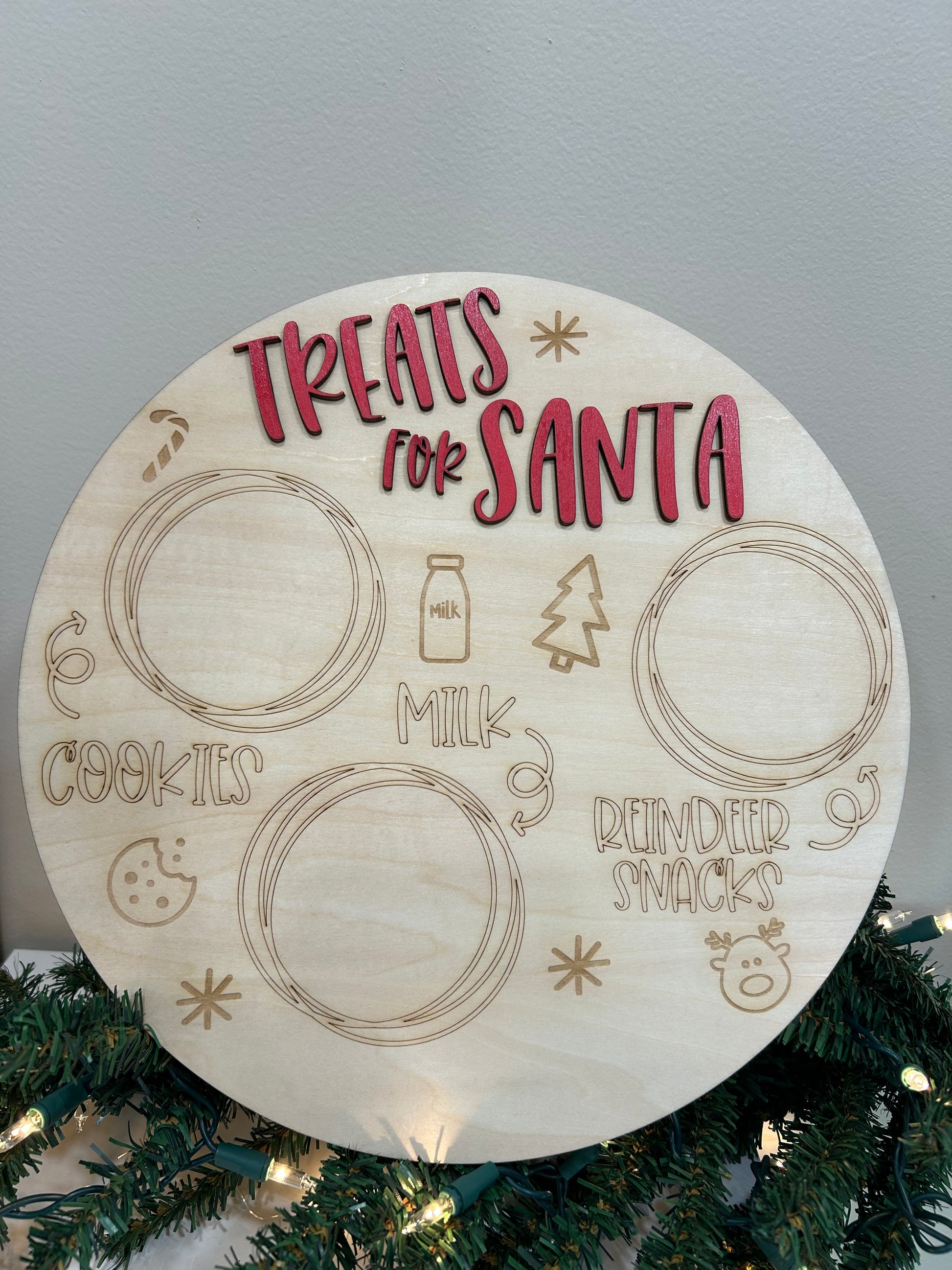 Laser-engraved wooden Santa treat tray. Features labeled spots for cookies, milk, and reindeer snacks with charming icons and swirls. A whimsical, reusable holiday essential for Christmas Eve traditions.
